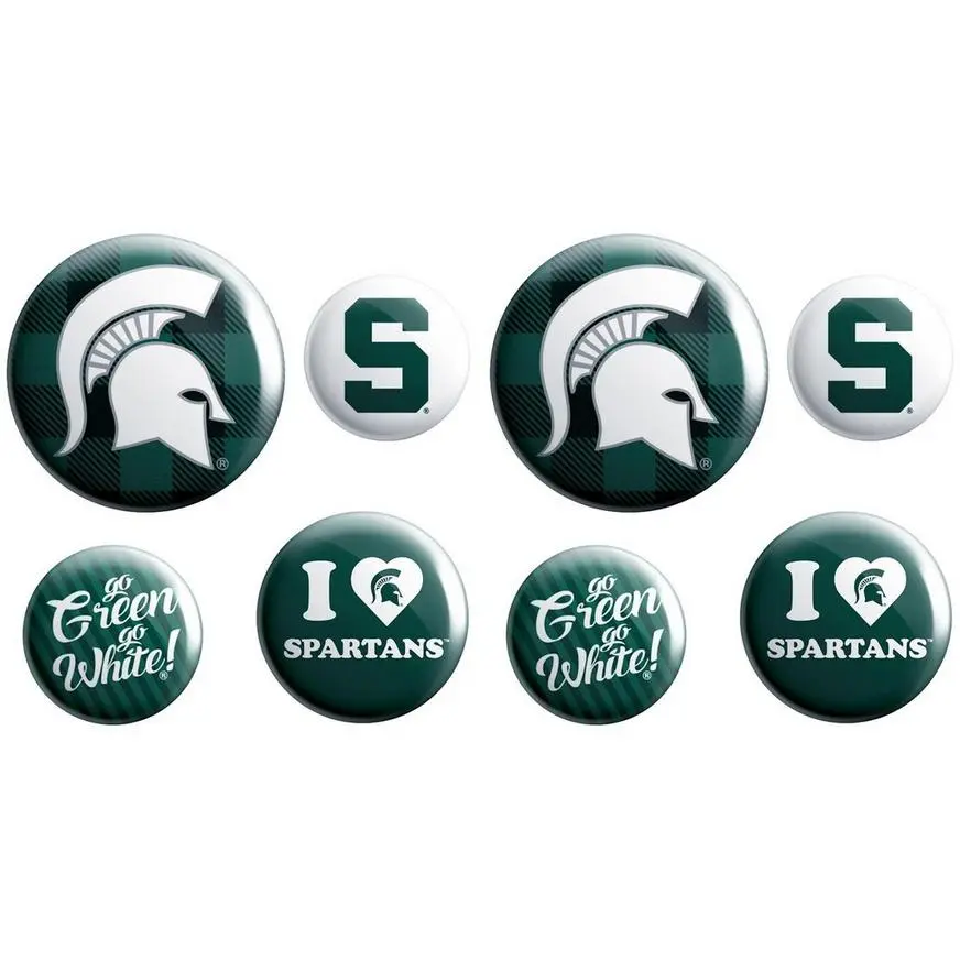 Wear your team pride everywhere you go! These Michigan State Spartans Buttons come in eight different designs featuring the team’s logo and colors. Pin them to your gym bag, T-shirt, backpack, and more, or share them with fellow fans at your next tailgate party. Michigan State Spartans Buttons have a safety pin closure.