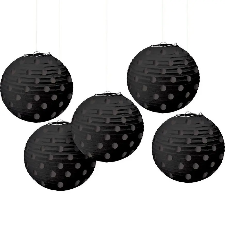 Mini Black Polka Dot Paper Lanterns will have your guests seeing spots! Made of paper, these round black lanterns are covered in shiny black polka dots. Easily expand these small black lanterns with the included wire frames and hang them around your party — their small size makes them versatile! Group them together or with other paper lanterns to match your polka dot theme or black decorations.