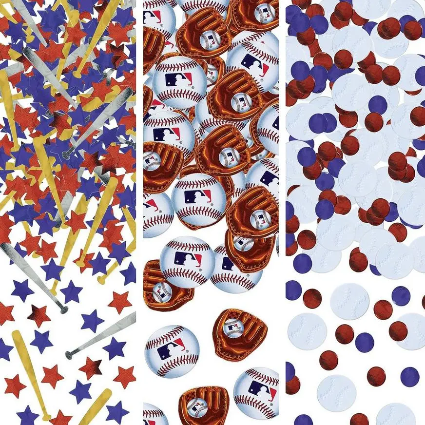 Hit one out of the park with MLB Baseball Confetti. This All-American assortment includes three fun mixes: gold and silver metallic foil baseball bats with red and blue stars, embossed foil baseballs with red and blue dots, and cardstock cutout MLB logo baseballs and gloves. Spread it across the table or sprinkle it inside party invitations or favor bags for some major league style.