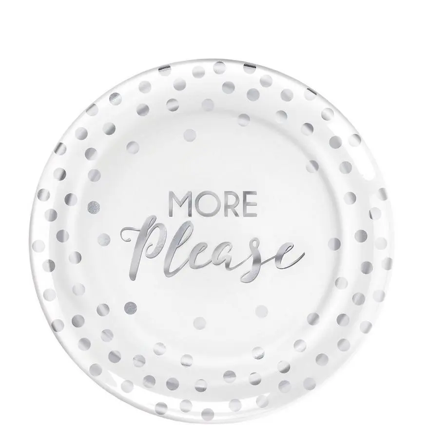 Add some shine to your party and have guests asking for more with these More Please Premium Plastic Dessert Plates! These plastic plates are white with metallic silver polka dots and have the phrase “More Please” on the middle of them. Make cleanup a breeze with these disposable plates — just toss them in the trash when you’re done. Set the table and serve up cake or other sweet treats to all your party guests with these small plates!