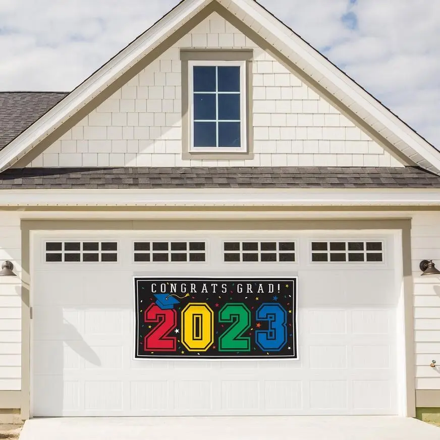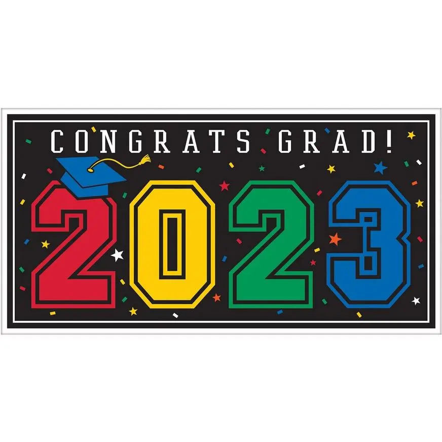 Celebrate their achievement with this multicolor 2023 gradation banner. The plastic banner features “2023” in big, colorful numbers below the message “Congrats Grad!” in white lettering. The background is black with colorful confetti. Put it in front of your home or up at the grad party for everyone to see.