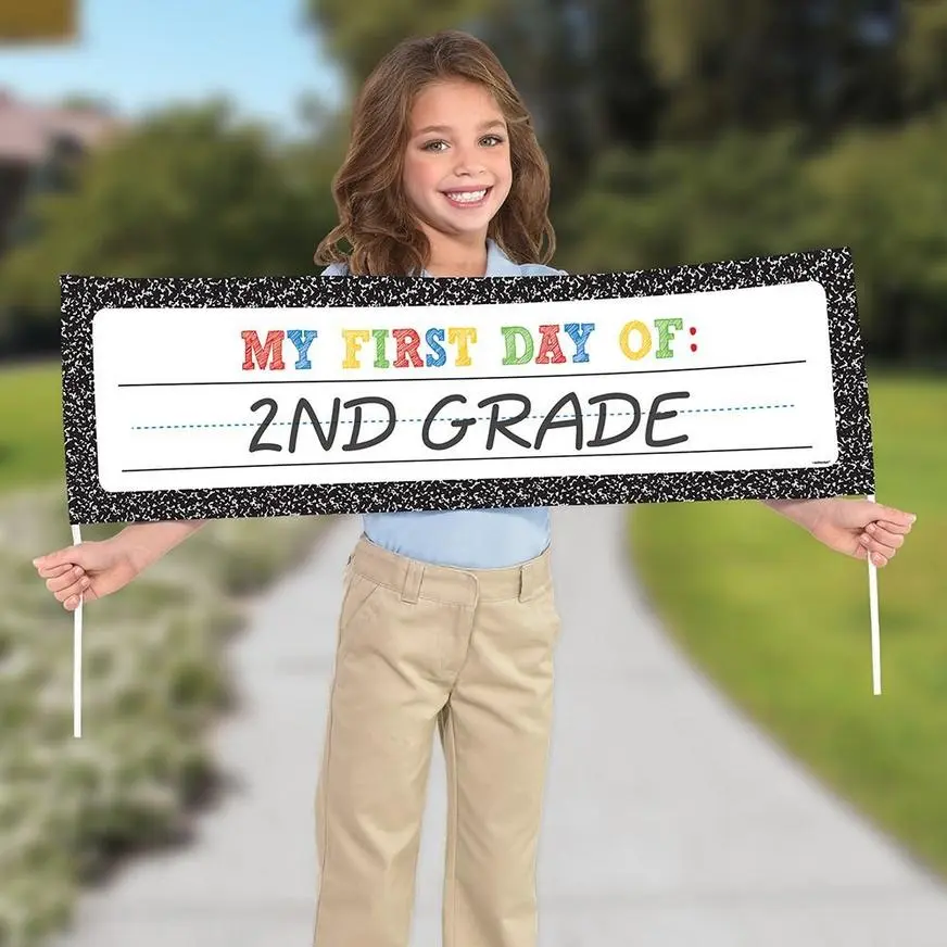 Capture the best back-to-school pictures with this My First Day Personalized Banner! The plastic banner features the headline “My First Day Of:” and a space for you or your child to write in their current grade level. The border is in a classic composition book pattern and there are attached plastic stick on either side to make it easier to hold. Use this prop every first day of school and see how your little has grown over the years.