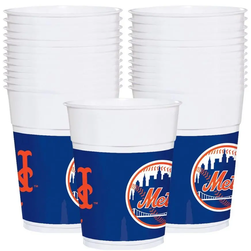 Enjoy game-winning beverages in New York Mets Plastic Cups! These baseball-themed plastic cups feature the official MLB and Mets logos on a wraparound blue print. Plus, they’re disposable for easy cleanup at your game day party.