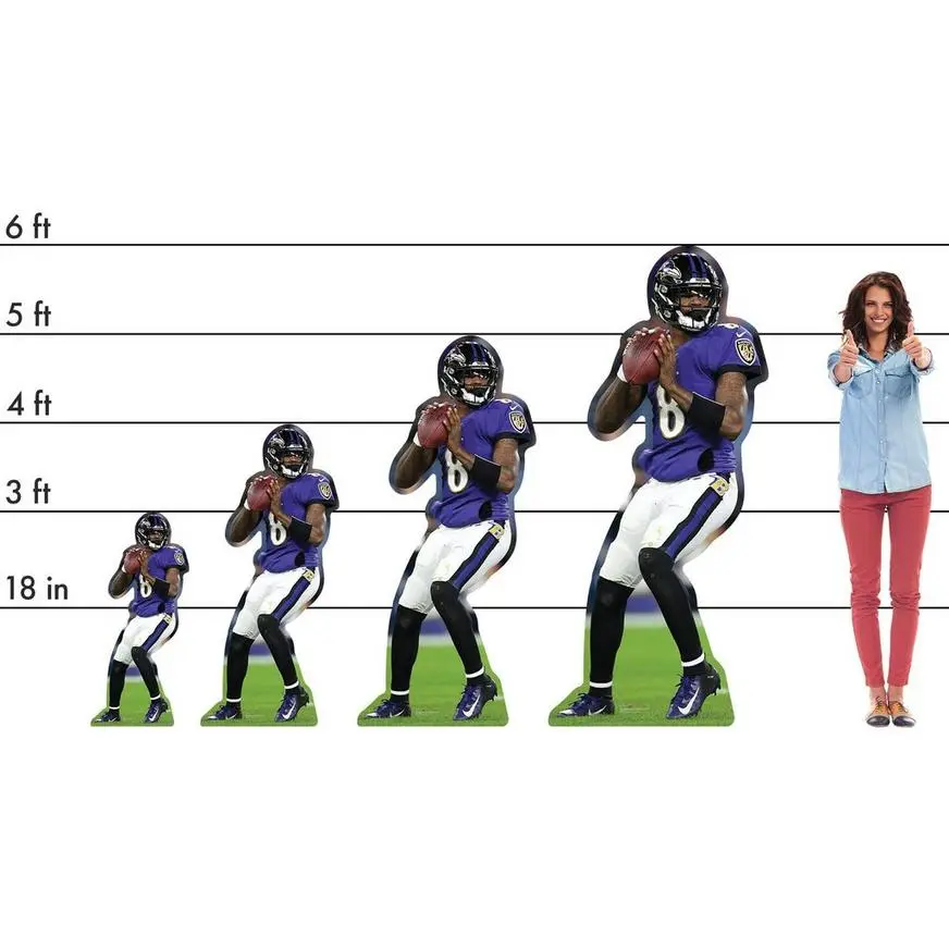 Create a picture-perfect scene by decorating with a Baltimore Ravens cardboard cutout. It comes in four sizes and features an action shot of Lamar Jackson and an easel back for support. Set up a cardboard cutout to accessorize your venue or place it in the photo booth at your game day party. Then guests can strike a few poses and capture pictures to remember the big event for years to come. NFL Baltimore Ravens Lamar Jackson Cardboard Cutout product details: 3ft tall Attached easel stand Assembly required Design on one side only