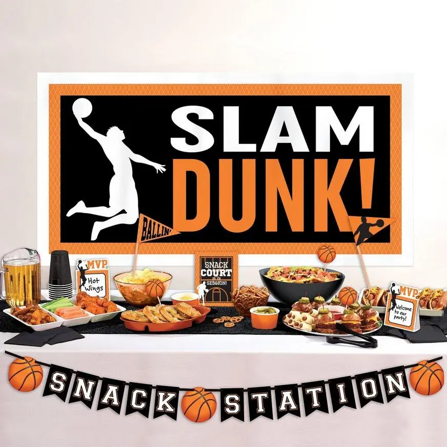Deck out the buffet table at your basketball-themed party with the Nothin’ But Net Buffet Decorating Kit. This decorating kit includes tent cards, picks, and banners featuring various basketball-themed designs in colors of black, orange and white. Mix and match these decorations with your team colors.
