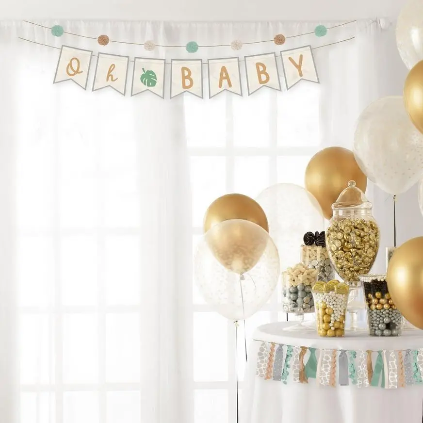 This garland set includes an “Oh Baby” pennant banner, a string of fluffy pom-poms, and a patterned ribbon tassel. Use them in different parts of your venue or together to create a picture-perfect scene.
