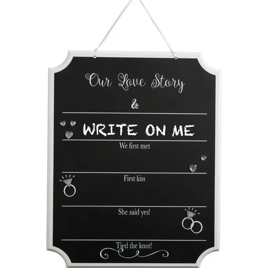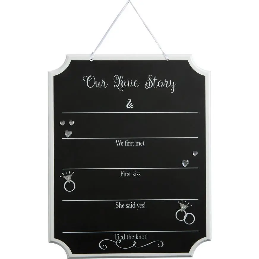 Share your love story with all of your guests! It is easy with this Our Love Story Wedding Chalkboard Sign. It features space to write where you first met, had your first kiss, where she said “yes”, and of course where you tied the knot. The white trim makes this fiberboard wedding sign really stand out for a sweet addition to your shabby chic reception decorations. Chalk sold separately.