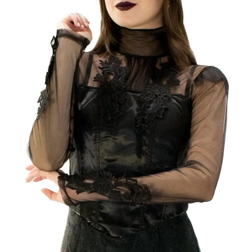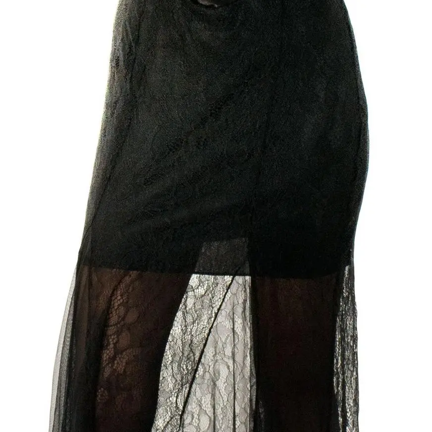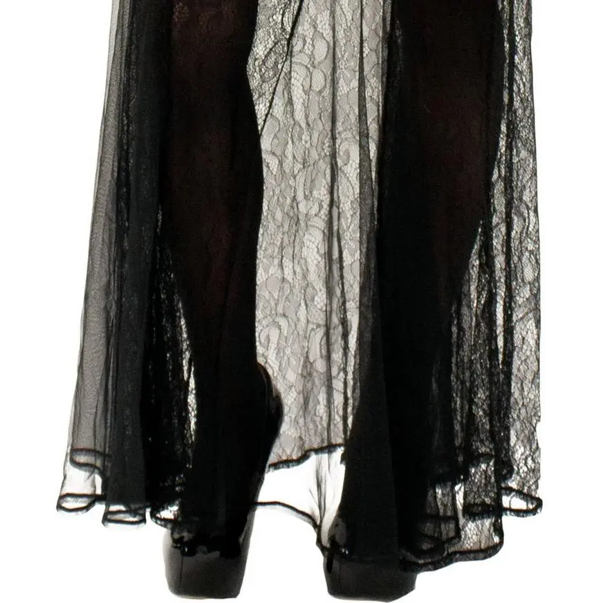 Live out your gothic dreams in this all-black costume. The floor-length dress is made of delicate mesh and intricate lace that’s layered over a mini dress with a corset-style bodice.