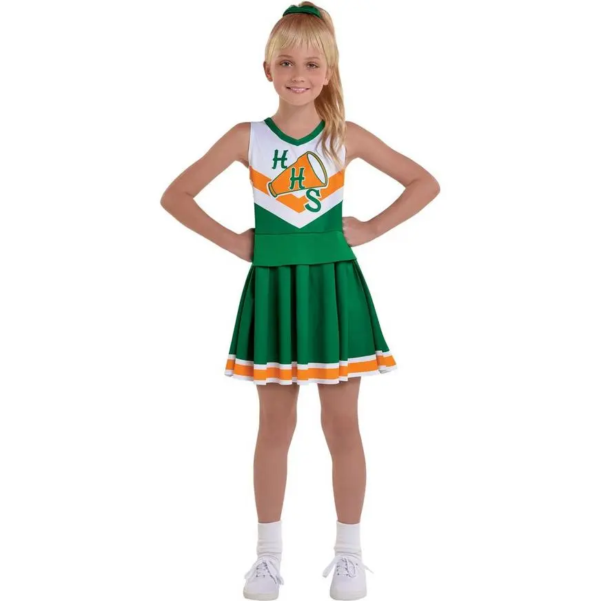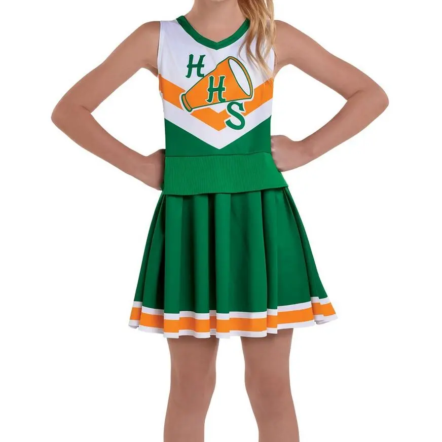 Find your preppy side as a Hawkins High cheerleader! From Stranger Things Season Four, this cheerleader costume for kids is green with orange and white trim and says “”HHS”” over a megaphone icon. The pleated skirt comes attached to the sleeveless top.