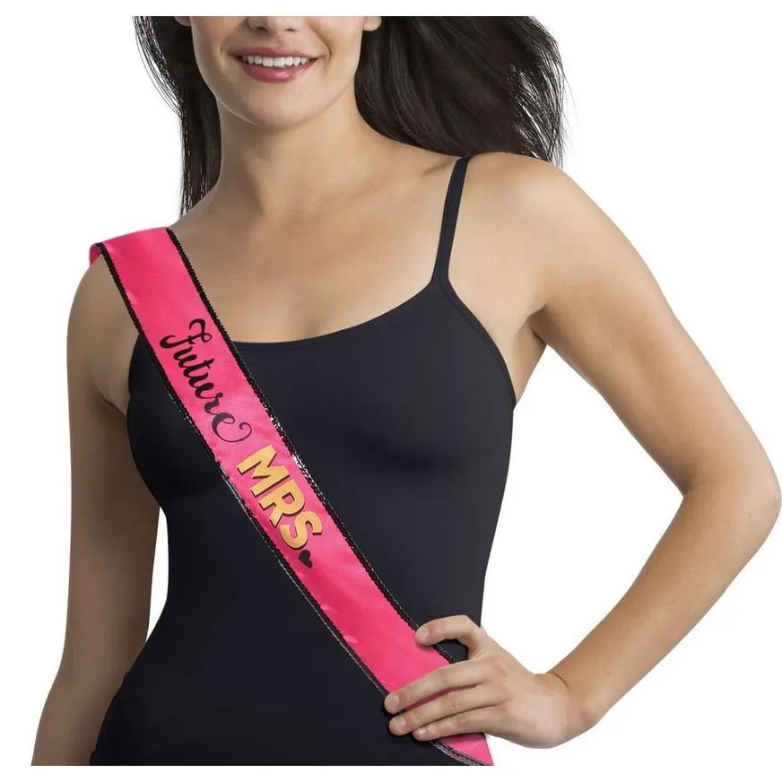 You’re soon to be a Mrs., but not yet! Stand out at your bachelorette party with our Sassy Bride Pink Future Mrs. Sash. This pink bachelorette sash is trimmed with black sequins and reads “Future Mrs.” The bride-to-be will feel like royalty with this sash added to her bachelorette outfit accessories!