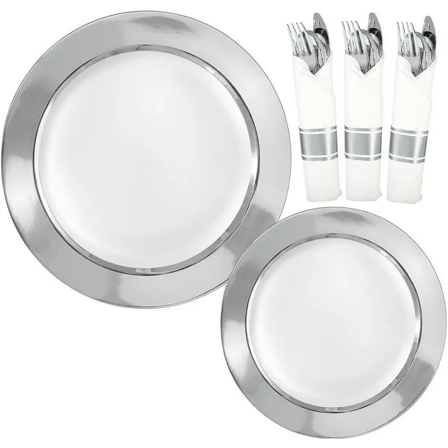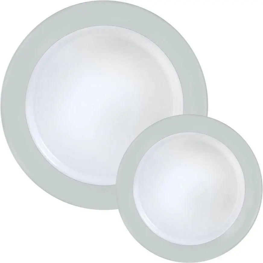 | 40 | Round Premium Plastic Dinner (10.25in) & Dessert (7.5in) Plates with Silver Border, (SKU 919846) |