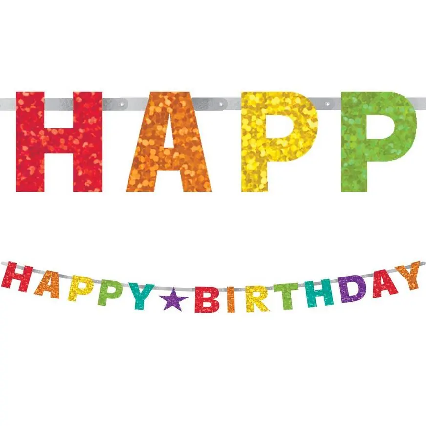 Your colorful personality will shine through when you decorate with a prismatic rainbow banner. This letter banner features rainbow cardstock cutouts that spell out “Happy Birthday” in a holographic finish. With a purple star spacer and attached strings for easy display, the banner adds a sparkling look to any rainbow birthday party! The jointed letters allow this decoration to fold up easily for storage and break it out again for future birthday parties.
