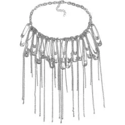 Embody anarchy with this silver safety pin necklace. This punk rock piece is a silver chain with attached safety pins around the neck and has long dangling silver chains dripping down your chest. Rock on!