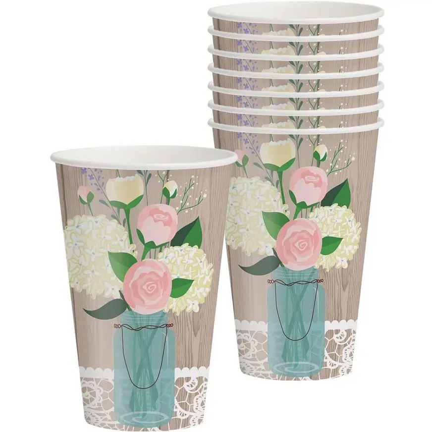 Drink to a lifetime of happiness with Rustic Wedding Cups! These disposable paper cups feature an image of a flower bouquet in a Mason jar against a natural wood background, with a white vintage lace border along the bottom. Toast to tying the knot with these Rustic Wedding Cups!