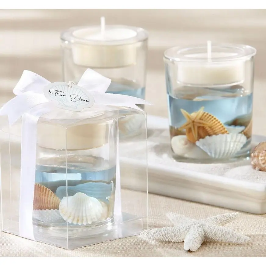 Decorating is a breeze with our Seashell Tealight Candle Holder! This glass tealight holder comes in its own clear plastic box and is filled with authentic seashells floating in an ocean blue gel. With its white satin ribbon and “For You” gift tag, this Seashell Tealight Candle Holder is the perfect decoration, centerpiece or party favor at your beach wedding, summertime bridal shower or themed party.