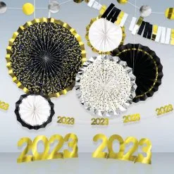 Black, Silver & Gold New Year’s Eve 2023 Cardstock Swirl & Fan Decorations, 12pc