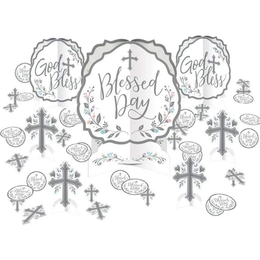 This set of cardstock table decorations features 3 centerpieces in white with silver crosses and headlines in silver script, like “God Bless” and “Blessed Day.”