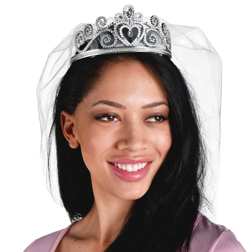 Get that bride-to-be look for your bachelorette party with this romantic tiara! It features silver rhinestones that arabesque into a heart shape, and a matching tulle veil.