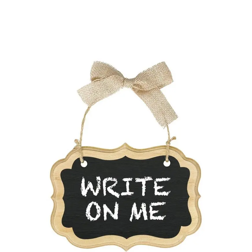 Add a cute and rustic look to your wedding with a Small Wood Border Scroll Chalkboard Sign! This fiberboard small chalkboard sign features an elegant, curved border with the look of natural wood. Great for displaying table numbers, names, or buffet table items, this versatile chalkboard sign is easy to hang by the attached string and includes a removable burlap bow so you can decorate your wedding reception, bridal shower, or baby shower.