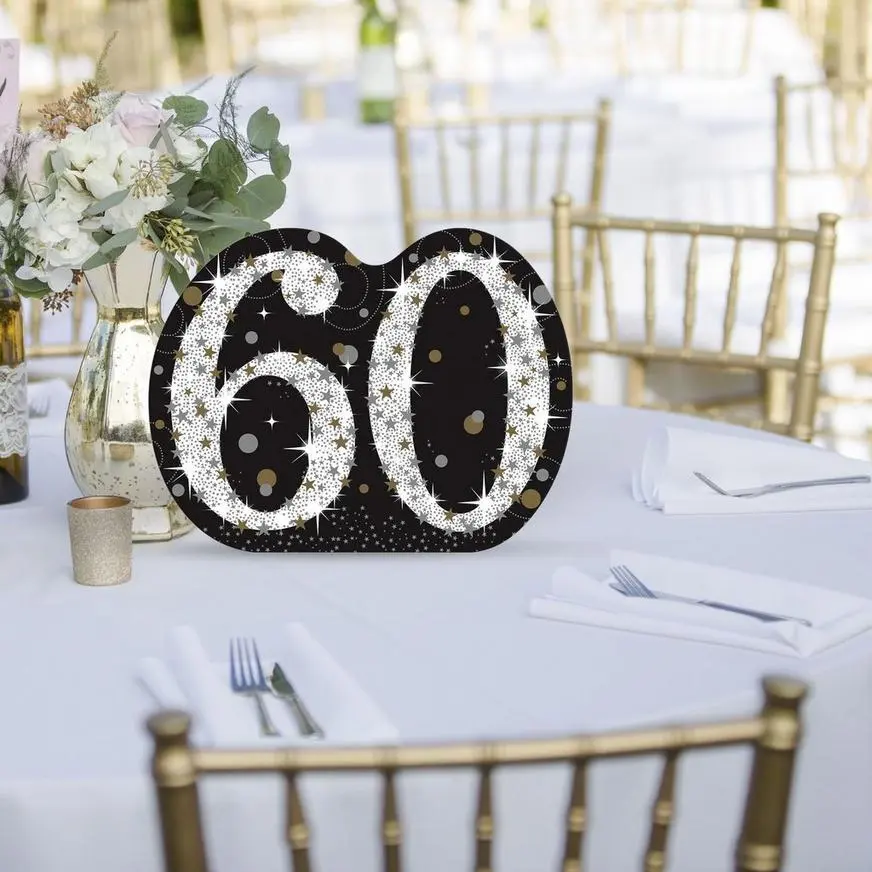 Set the table with a sparkling cardboard cutout for a picture-perfect scene. The cardboard cutout is shaped like the number “60” with a confetti background and it has an easel back for support. A themed centerpiece is an easy way to bring your loved one’s milstone birthday party to the next level, and it can even be reused as a photo prop for your selfie station!