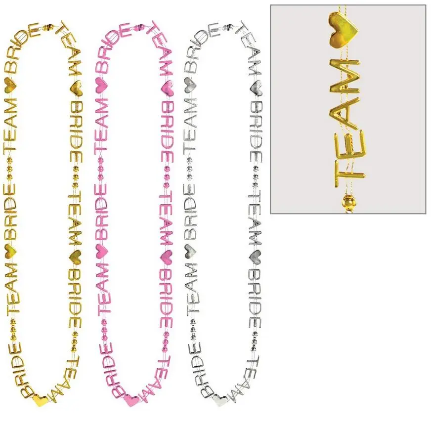 Be the best Team Bride crew around with these fun bead necklaces. These bead necklaces come in silver, gold, and pink, and feature the phrase Team Bride, hearts and small beads.