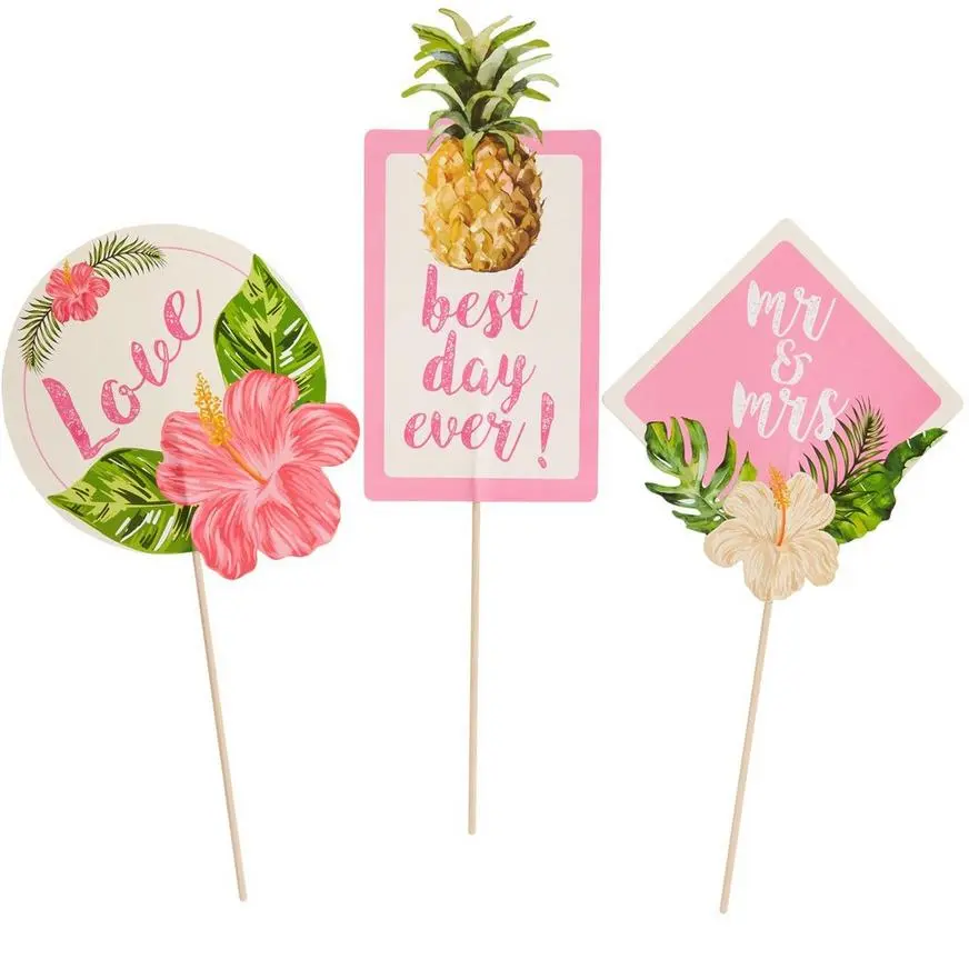 Add a tropical to your centerpieces with Tropical Wedding Centerpiece Sticks! These centerpiece sticks come in three unique designs: a round one that reads “Love” with flowers, a square one that reads “Mr. & Mrs.” with flowers, and one that is rectangle with a pineapple and reads “Best Day Ever.” All centerpiece cutouts are attached to wooden sticks so you can add them to vases or bouquets at your bridal shower tea party, engagement party, or tropical wedding.