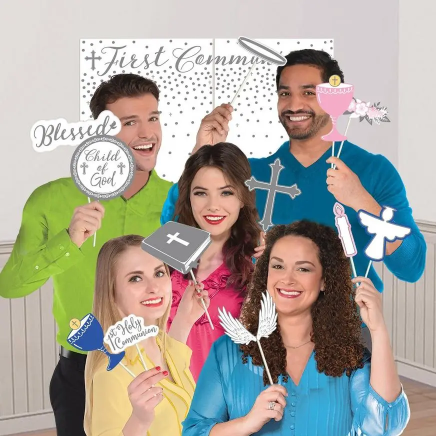 Set up a selfie station for your little one’s first communion celebration with this easy-to-assemble backdrop. The four-piece poster comes together to read “First Communion” across the top in gray with a showering of dots spread across the remainder of the length. Included are cardstock props shaped like candles, crosses, halos, wings, and more, all attached to plastic sticks for easy handling. c