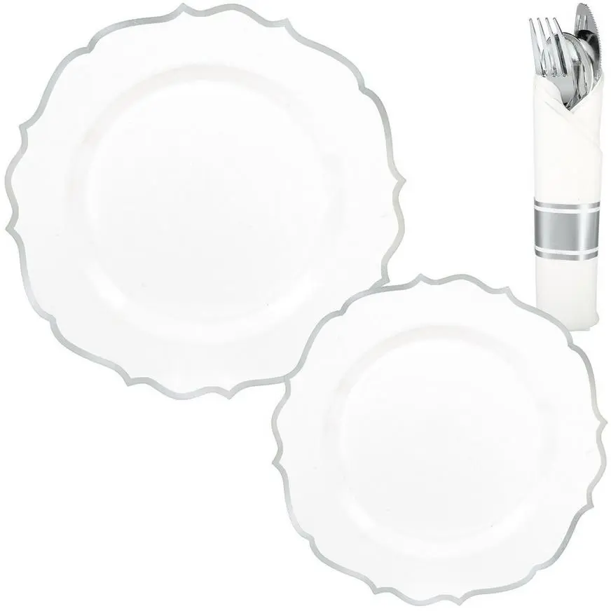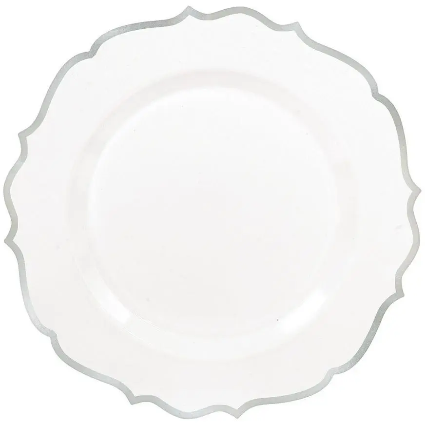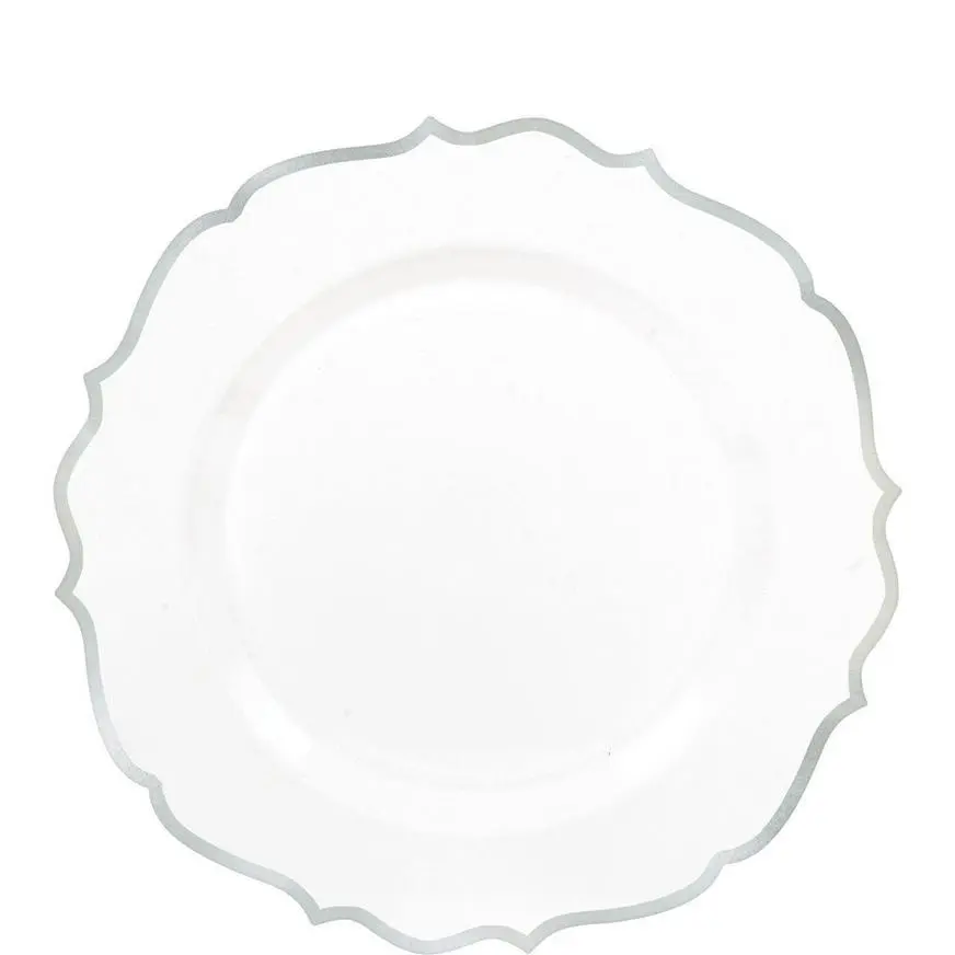 | 40 | White With Ornate Silver Rim Premium Plastic Dinner Plates, 10.5in, (SKU 937786) |