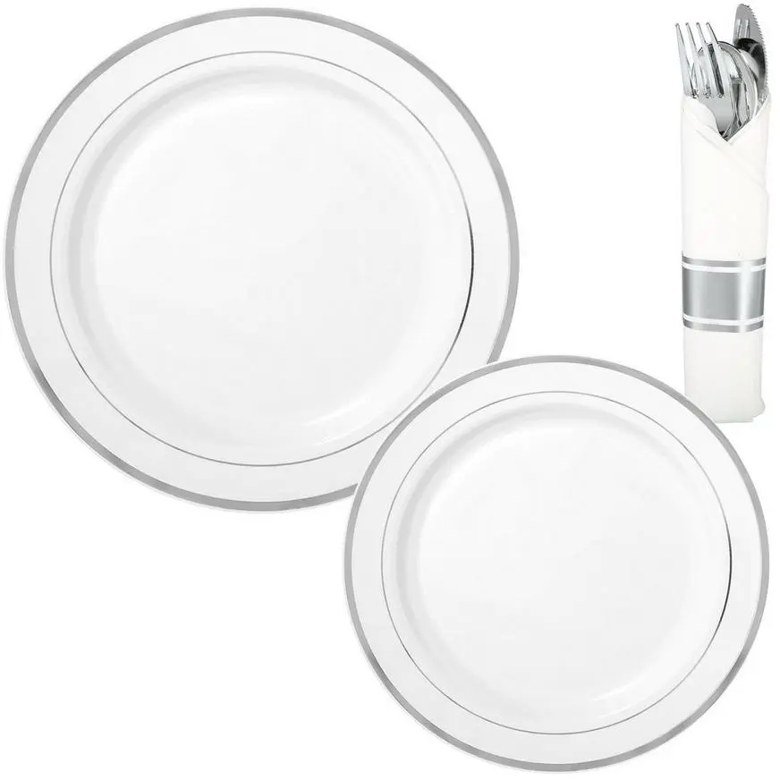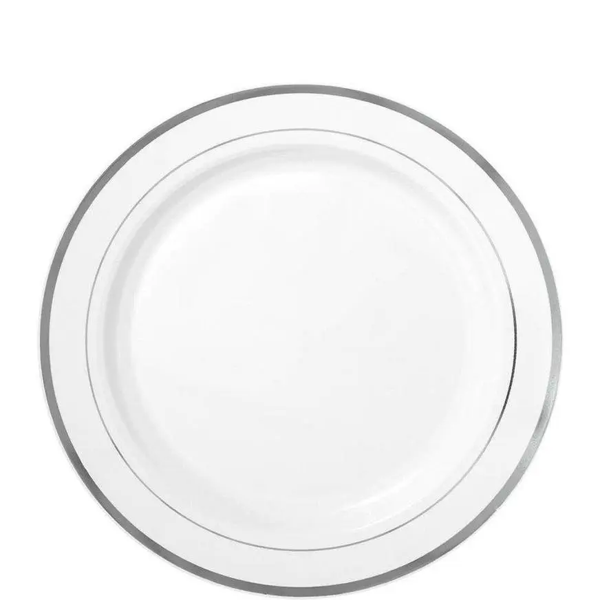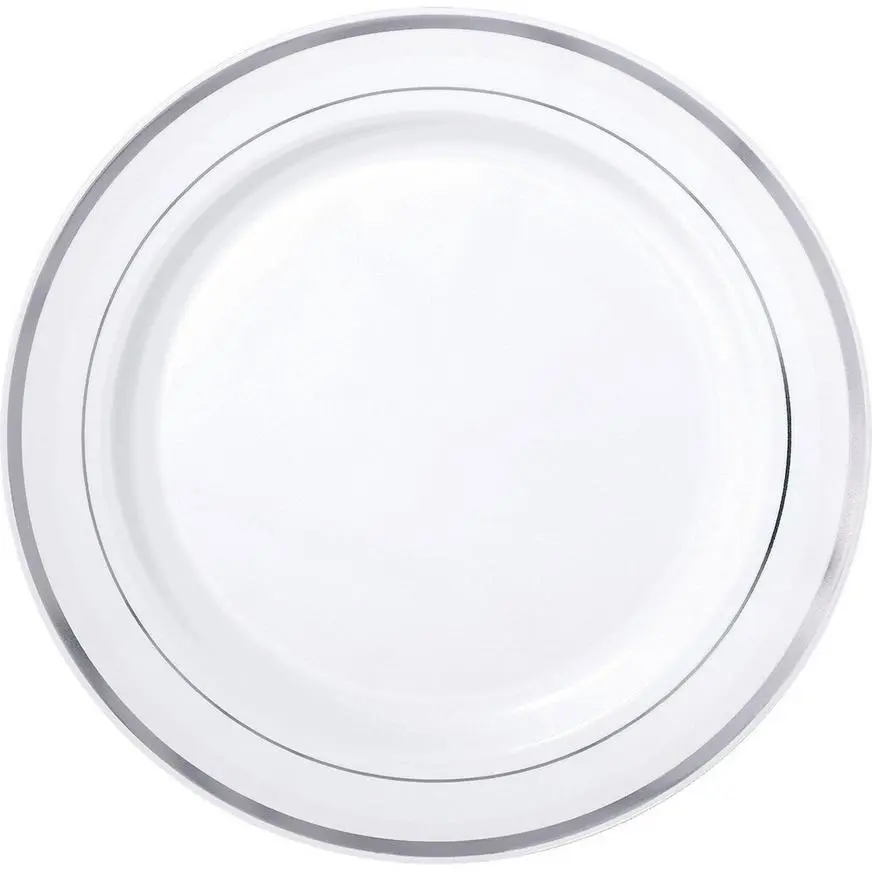 | 40 | White With Silver Rim Premium Plastic Dinner Plates, 10.25in, (SKU 937780) |
