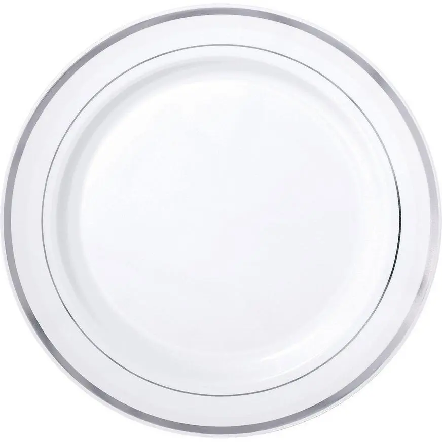Entertain in style with these premium plastic dinner plates. They come in classic white and feature a metallic silver double border. With the look of fine china and the convenience of plastic, these large plates are a party staple. Their elegant color palette is suitable for a variety of occasions, including luncheons, birthdays, weddings, and beyond.